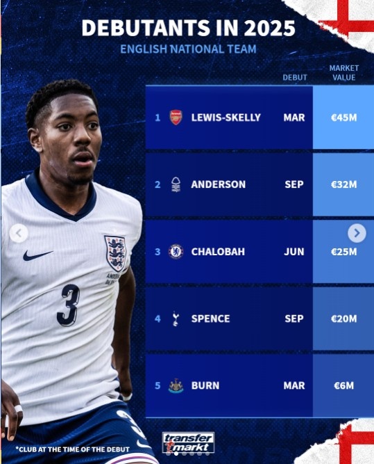 • 2025年英格兰队上演首秀球员:斯凯利、查洛巴、斯宾塞在列